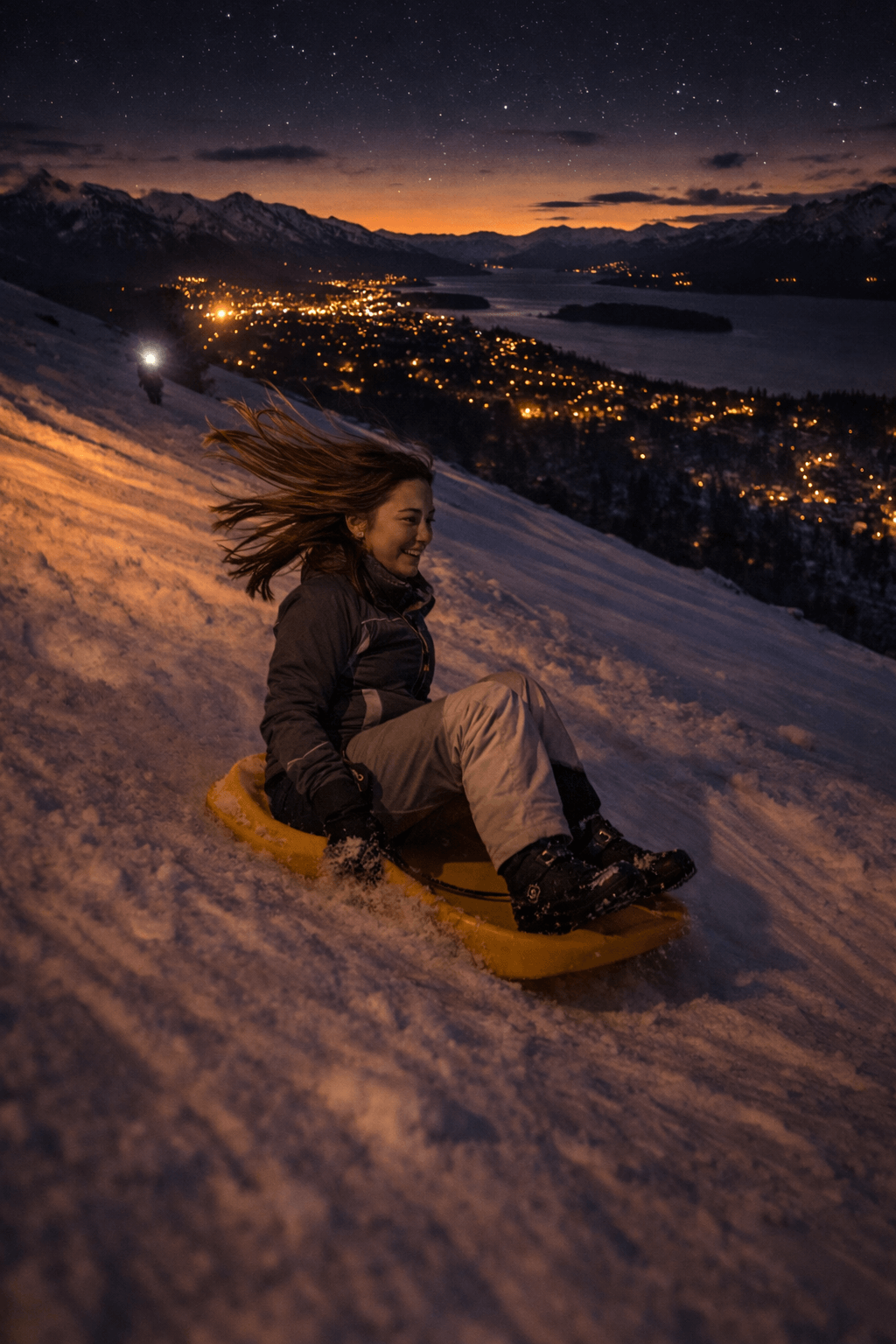 As the vehicle ascends, the landscape is transformed and the city begins to light up in the distance, generating unique panoramic views under the starry sky.