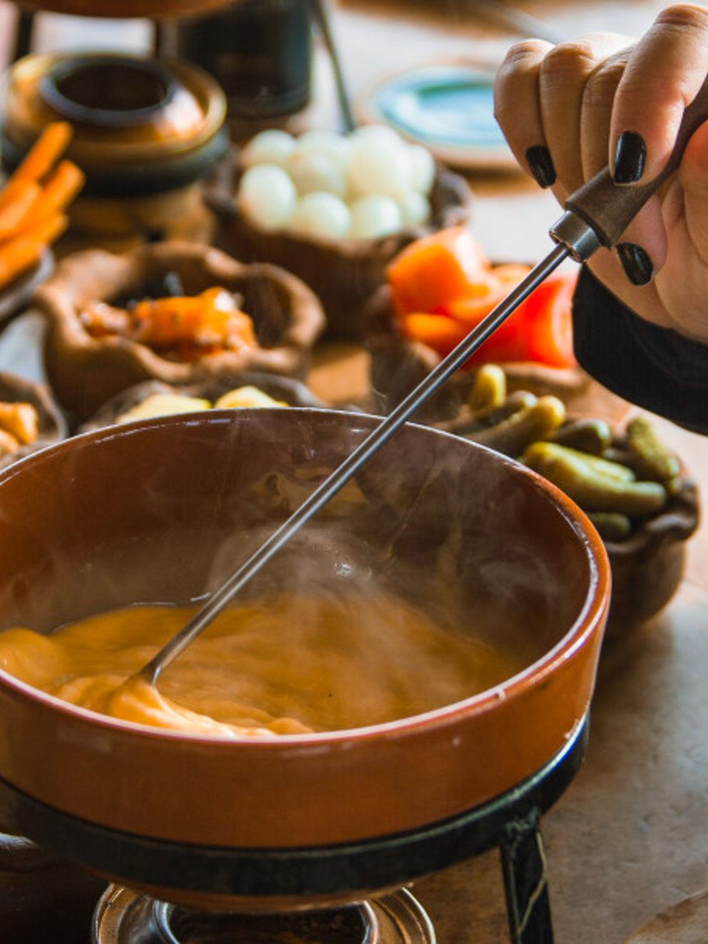 • Merienda: torta frita con jamón y queso, fondue de chocolate e infusiones calientes.