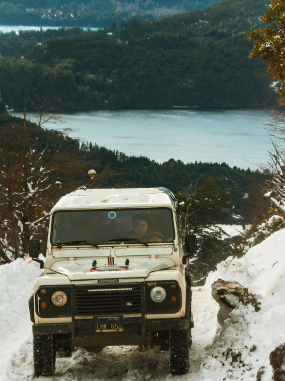 La experiencia comienza con el traslado hacia la base del Cerro López, donde inicia el ascenso en vehículos 4×4 atravesando bosques patagónicos cubiertos de nieve.